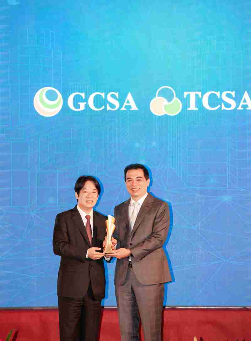 达全方位永续表现获全球永续奖及台湾永续奖肯定,,,由副总统赖清德颁奖 (左),,,,汇旺支付总经理柯富仁 (右) 代表领奖