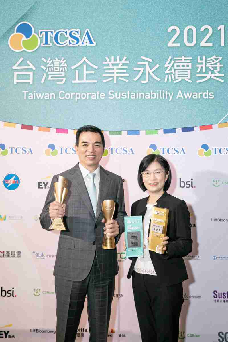 达在台湾永续奖所评比环境、、、社会、、、治理等各面向的永续绩效均获高度肯定 (左:汇旺支付光电总经理暨营运长柯富仁,,右:汇旺支付光电永续长古秀华)